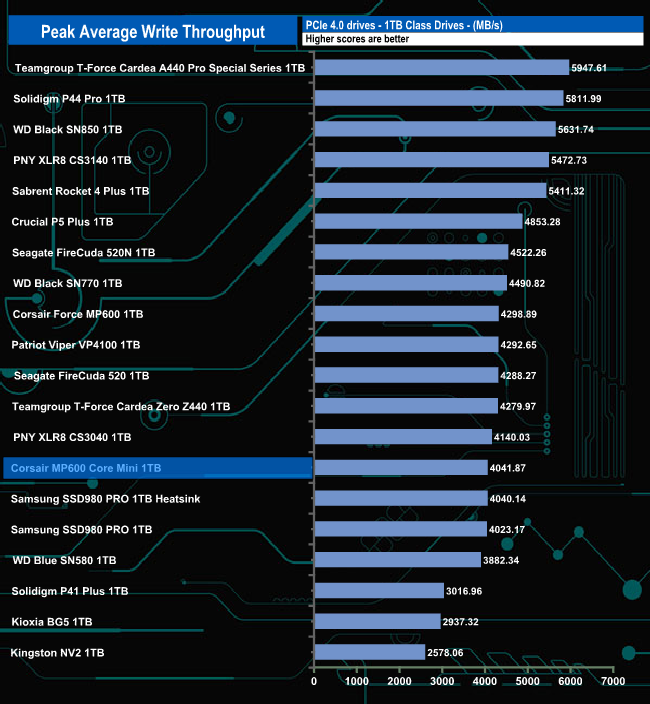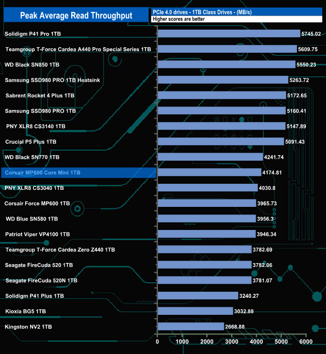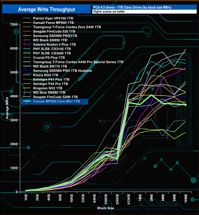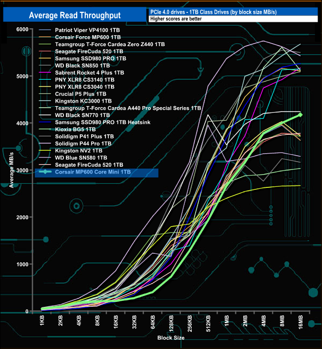 In our read-throughput test, the 1TB MP600 Core Mini peaked at 4,174MB/s at the end of the test run at the 16MB block mark. That test result is some 826MB/s short of the official maximum of 5,000MB/s.