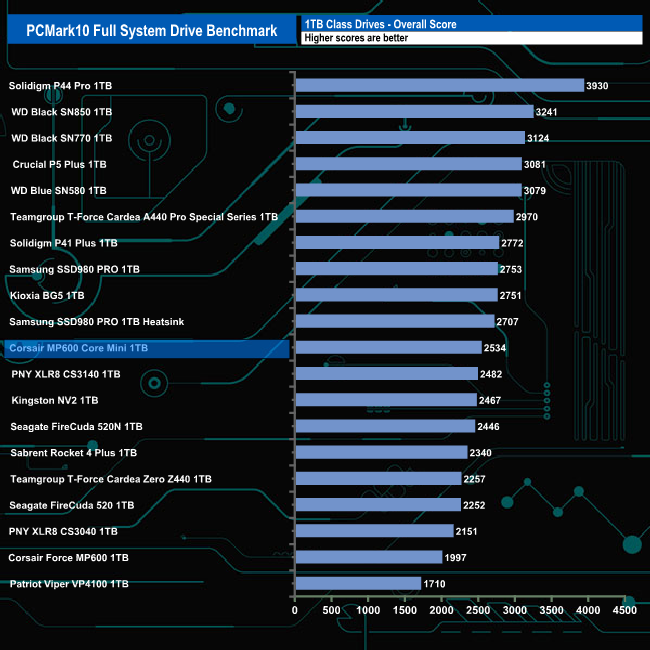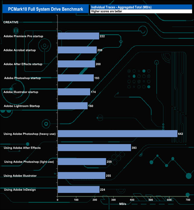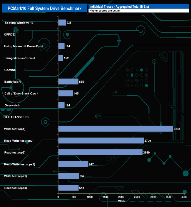 The PCMark 10 Full System Drive Benchmark uses a wide-ranging set of real-world traces from popular applications and common tasks to fully test the performance of the fastest modern drives. The benchmark is designed to measure the performance of fast system drives using the SATA bus at the low end and devices connected via PCI Express at the high end.