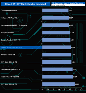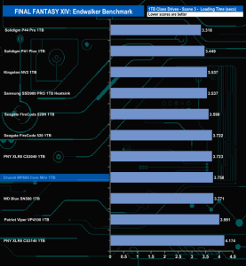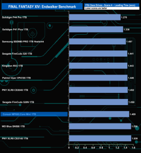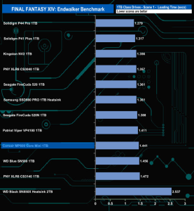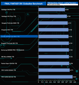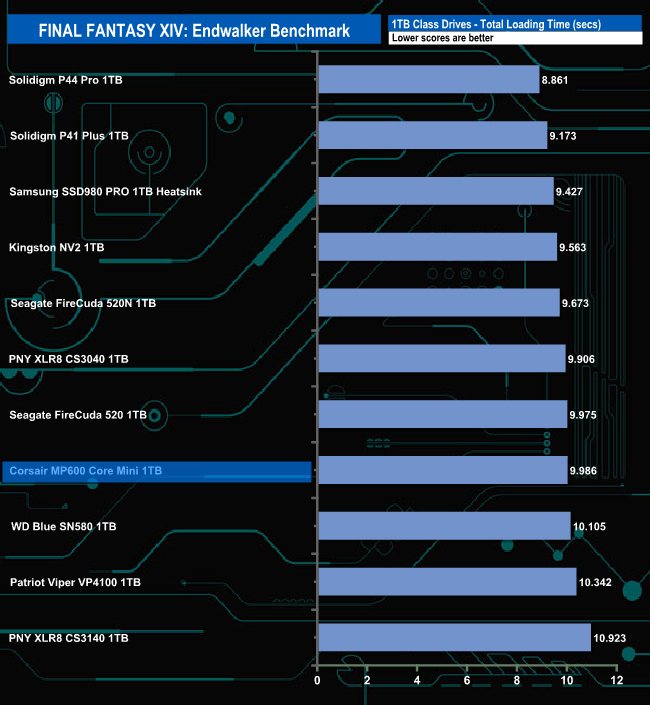 Corsair's MP600 Core Mini doesn't do that well enough in the Final Fantasy XIV Endwalker Official Benchmark. It doesn't get close to topping any of the individual scene load times and overall it ends up in the bottom four in the results chart.