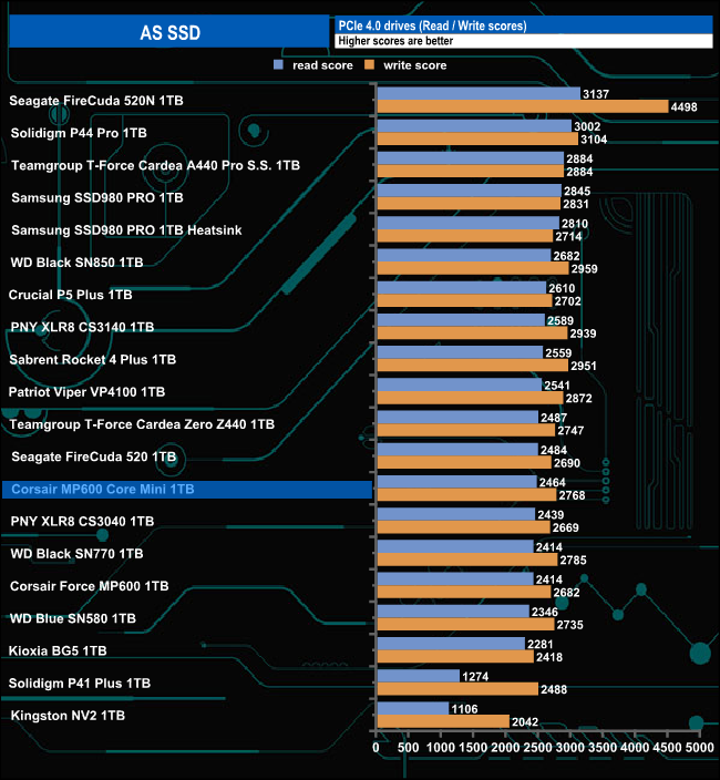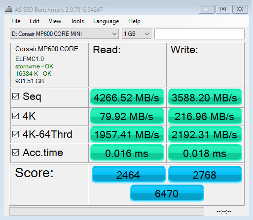 Using the AS SSD benchmark the drive's read score of 2464 sees the drive in the bottom half of the results chart. However, its write score of 2768 is better.