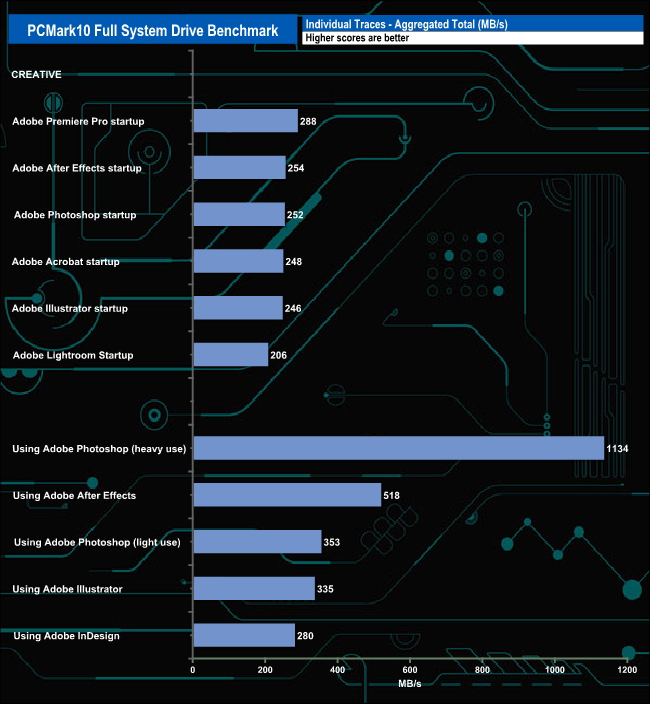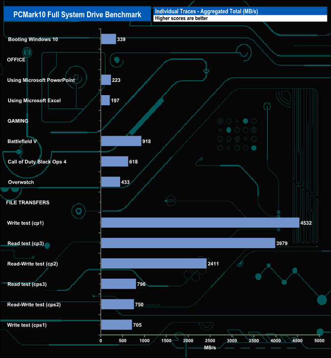 The PCMark 10 Full System Drive Benchmark uses a wide-ranging set of real-world traces from popular applications and common tasks to fully test the performance of the fastest modern drives. The benchmark is designed to measure the performance of fast system drives using the SATA bus at the low end and devices connected via PCI Express at the high end.