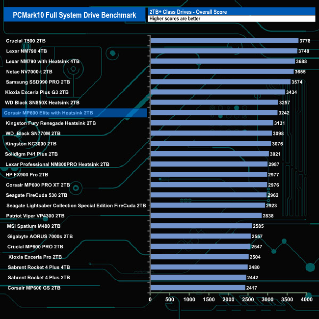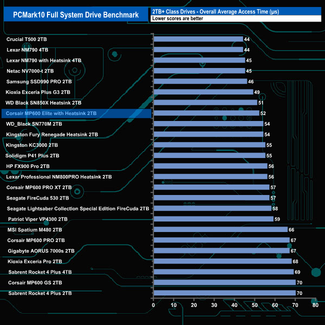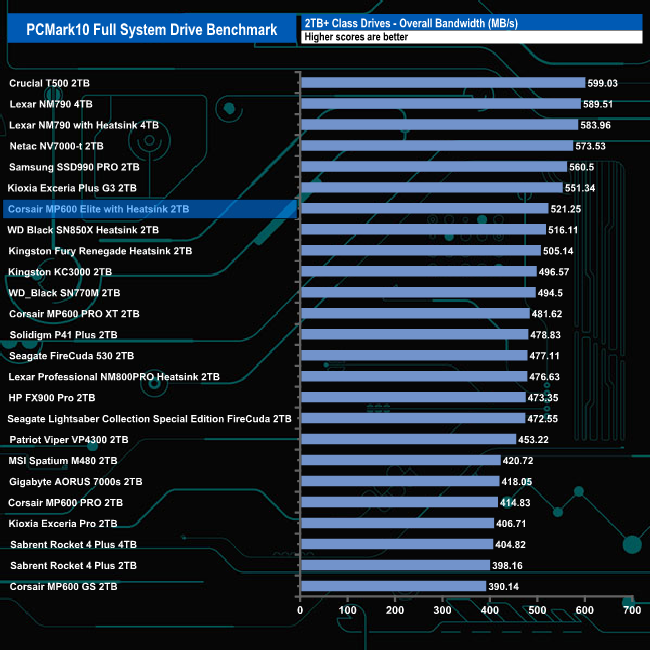 With an overall bandwidth figure of 521.25MB/s, the 2TB Corsair MP600 Elite with Heatsink slots into the seventh spot on the results chart. It's comfortably the fastest MP600 model we've tested using this benchmark.