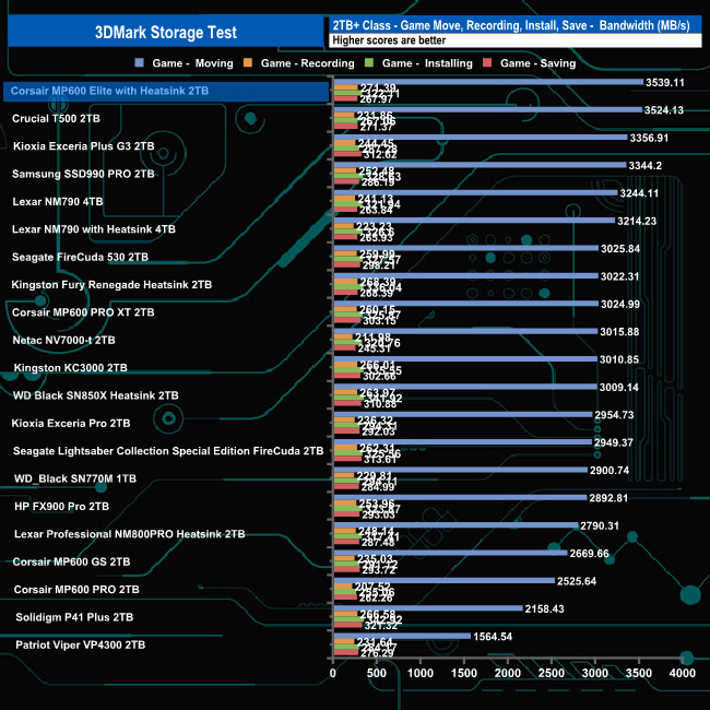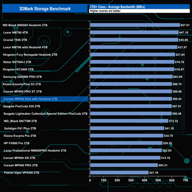 The average bandwidth figure for the drive was 598.43MB/s, a score that sees the Corsair MP600 Elite with Heatsink positioned in mid-table.