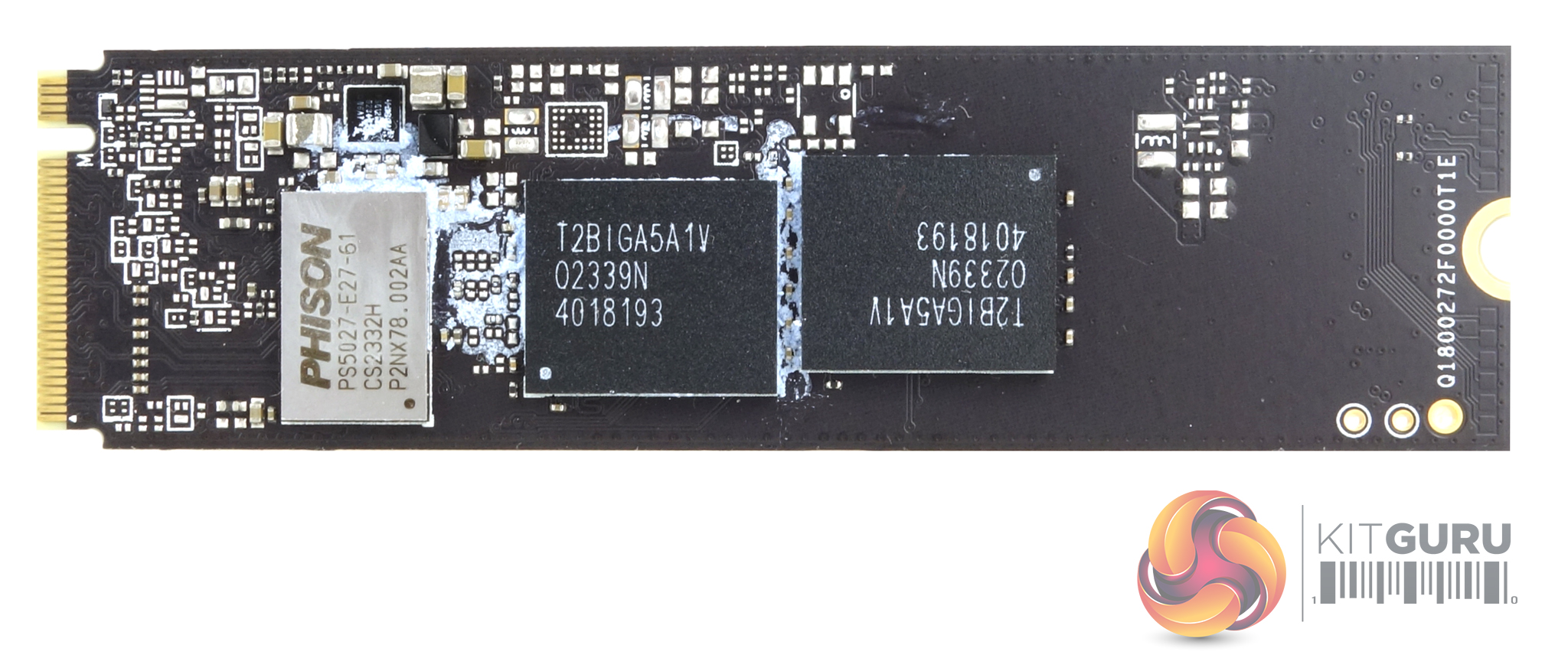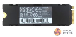 Under the heatsink sits the Phison PS5027-E27T controller controller along with two 1TB packages of Kioxia BiCS6 162-layer TLC NAND. Designed for DRAM-less operation, Phison's PS5027-E27T is a 4-channel controller built on a 12nm TSMC process. It uses single-CPU architecture (built-in ARM 32-bit Cortex-R5) and supports up to 8TB of both TLC or QLC NAND (Toggle 5.0 and ONFi 5.0 compliant) with transfer rates of up to 3600MT/s. Data reliability is provided by Phison's 5th generation LDPC ECC along with End-To-End Data Path Protection. It also supports AES 256-bit Encryption.