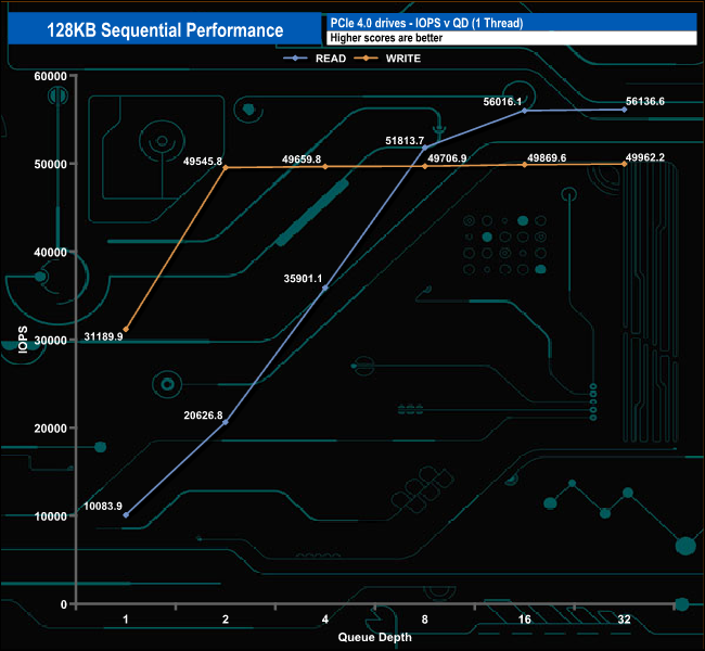 We used CrystalDiskMark 8‘s custom settings to test the Sequential read and write performance of the drive through a range of queue depths. The setup for the tests is listed below.
