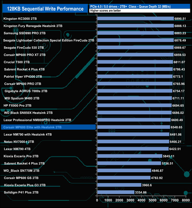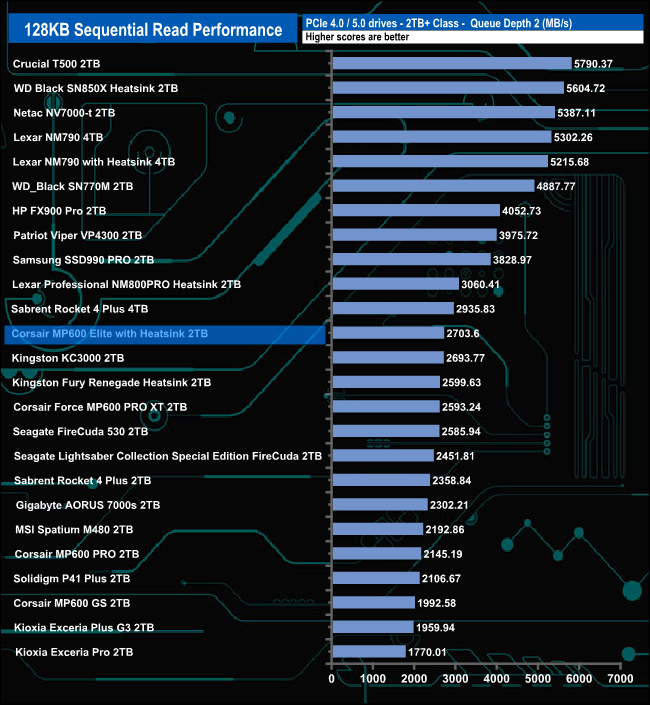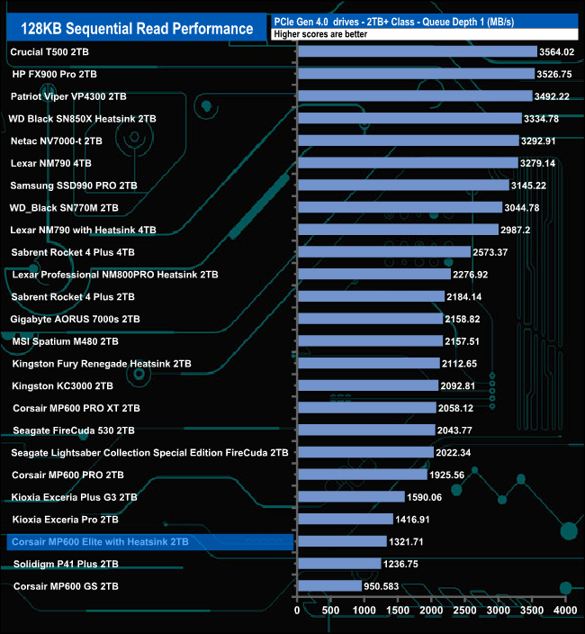 At QD1 the MP600 Elite with Heatsink sits in the bottom section of the chart. At QDs 2 and 4 it moves up to the middle of the chart but at QD32 it starts to move down the chart again.