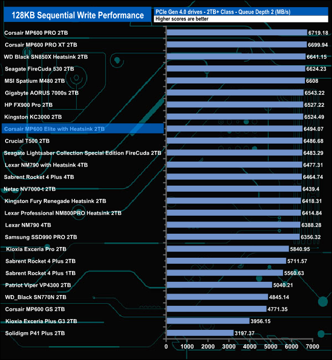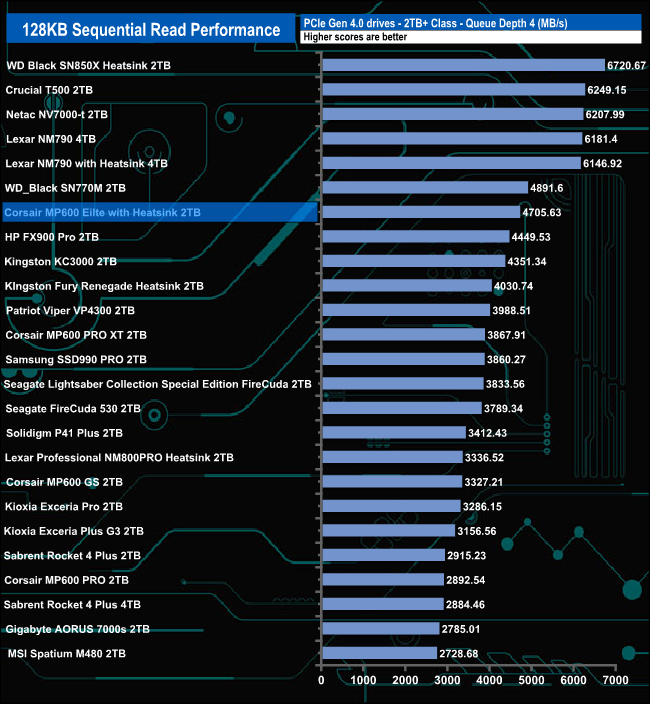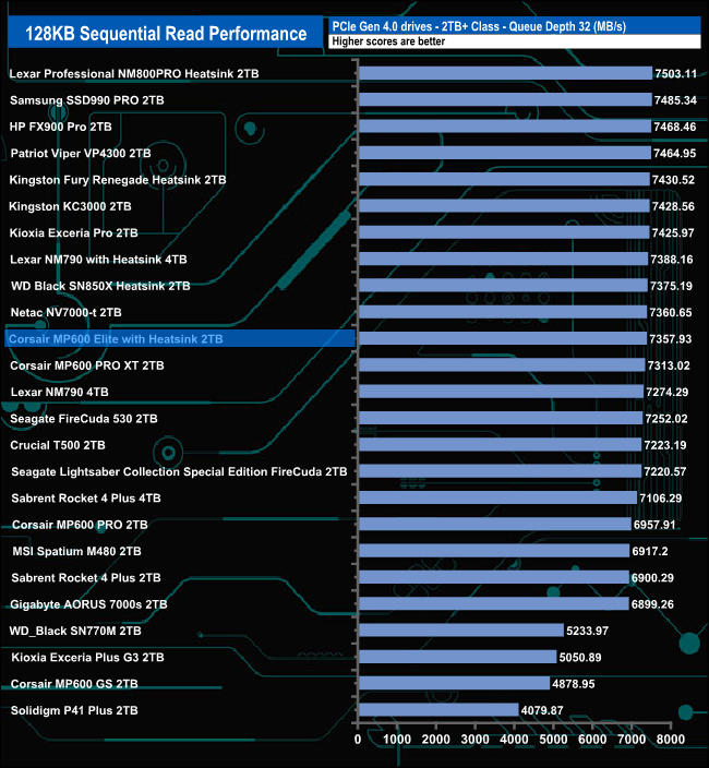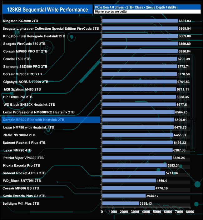 With our 128KB Sequential tests, we could confirm both the official read and write ratings of up to 7,000MB/s and up to 6,500MB/s respectively with a read test result of 7,357MB/s with writes at 6,548MB/s.