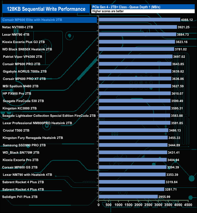 At QD1 the drive is the fastest Gen 4 drive we've seen to date for Sequential writes. However, as the QD deepens the performance starts to drop back and the drive slips down the results tables.