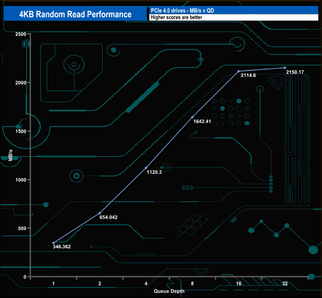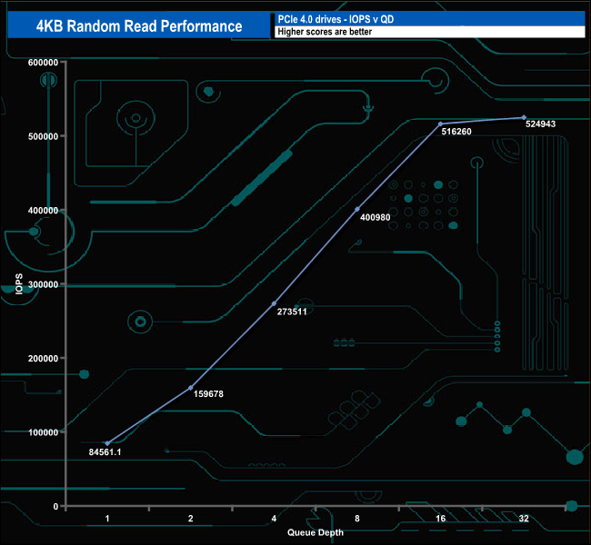 We used CrystalDiskMark 8‘s custom settings to test the 4K random read performance of the drive through a range of queue depths. The setup for the tests is listed below.