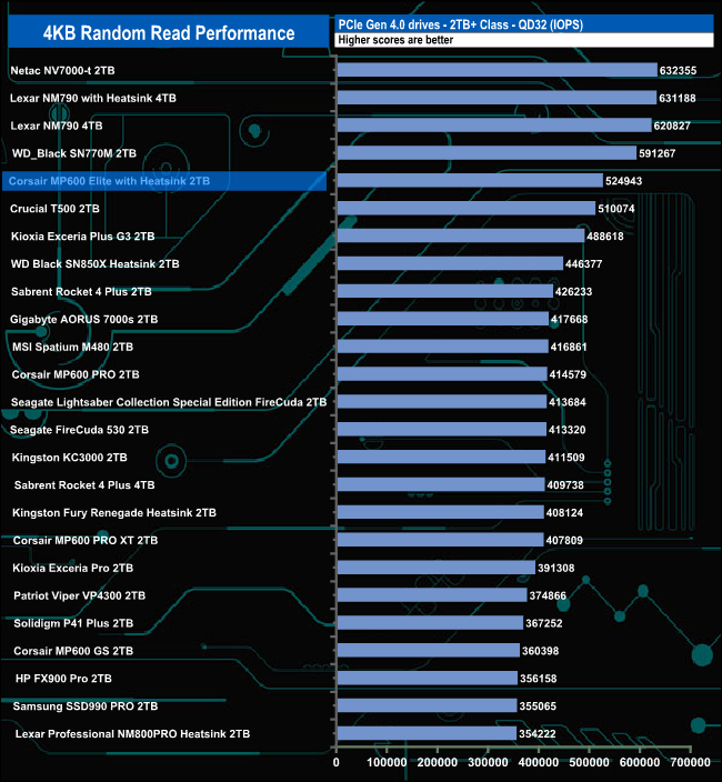 Officially the 2TB Corsair MP600 Elite with Heatsink is rated as up to 1,000,000 IOPS for 4K random reads. With our four-threaded tests, we couldn't get close to the official figure with a peak test result of 524,943 IOPS (2,150MB/s) at QD32.