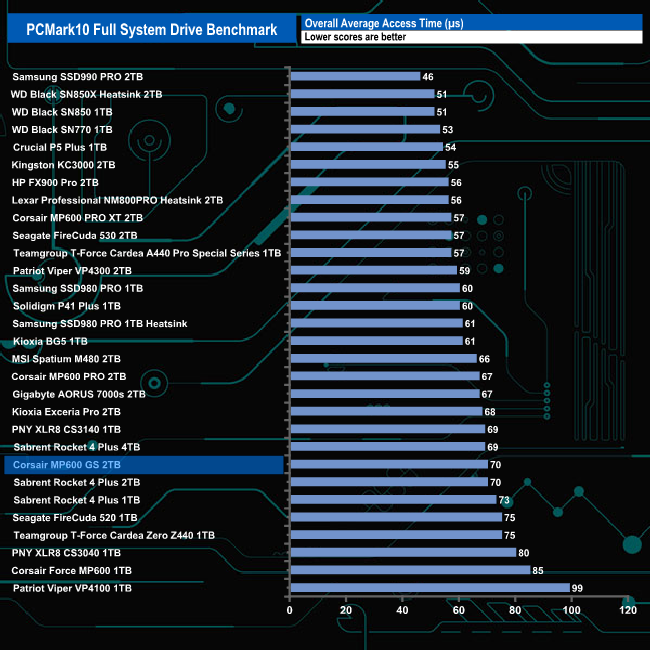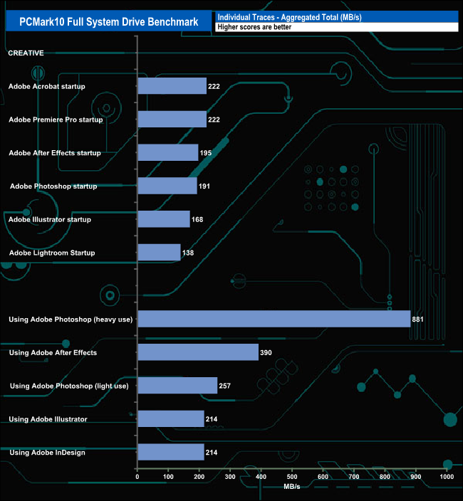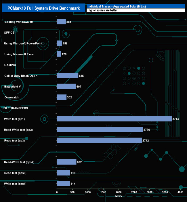 The PCMark 10 Full System Drive Benchmark uses a wide-ranging set of real-world traces from popular applications and common tasks to fully test the performance of the fastest modern drives. The benchmark is designed to measure the performance of fast system drives using the SATA bus at the low end and devices connected via PCI Express at the high end.