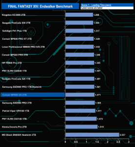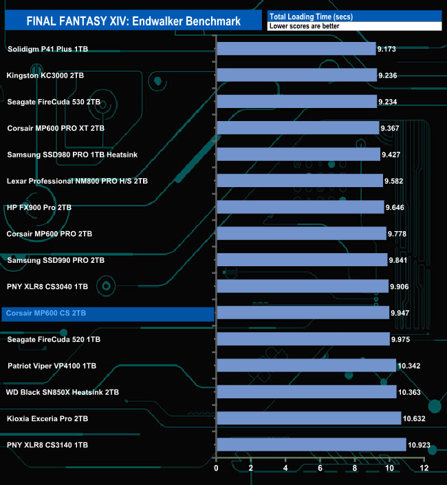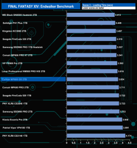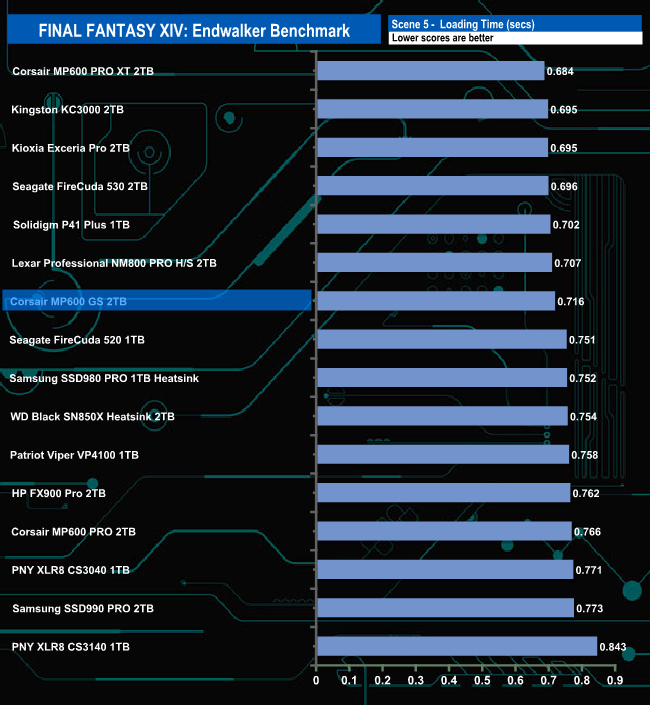 In the Final Fantasy XIV Endwalker Official Benchmark, the MP600 GS gives a total load time of 9.947 seconds. When it comes to the individual scenes the benchmark uses, the MP600 GS performs the best in the fifth and final scene with a load time of 0.716 seconds.