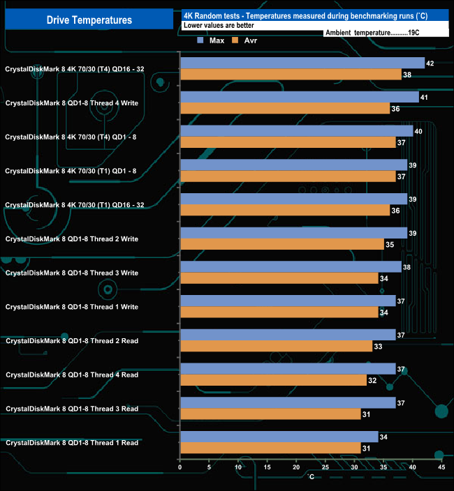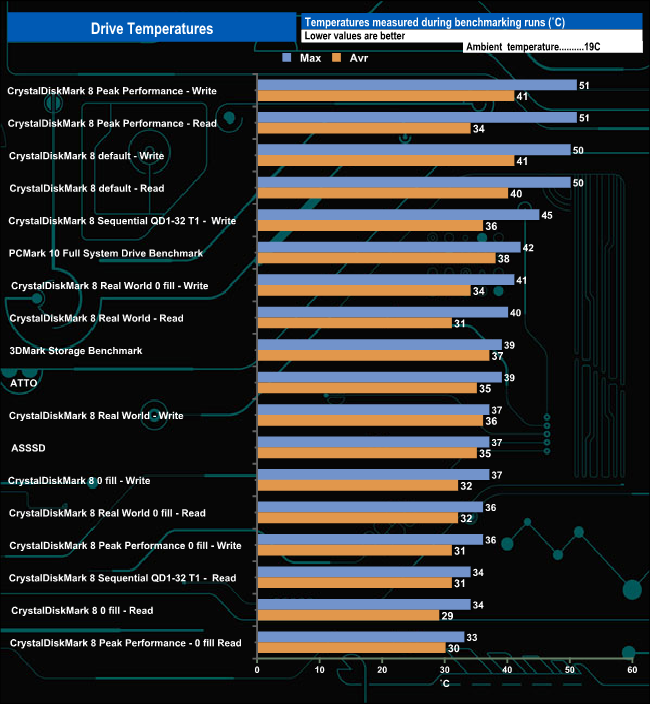 We took note of the drive’s temperature during some of our benchmarking runs. Corsair's MP600 GS doesn't come with any form of heatsink which is always a bit of a worry because of the heat that Gen 4 drives generally put out. That worry is alleviated in the MP600 GS somewhat by the fact it uses a four-channel controller. The hottest the drive got during benchmarking was when it was running the default Peak Performance profile in CrystalDiskMark 8; 51°C for both reads and writes, which is about as close to the 70°C maximum you would want to get. When running the 4K tests the drive averaged 38°C comfortably inside that official limit.
