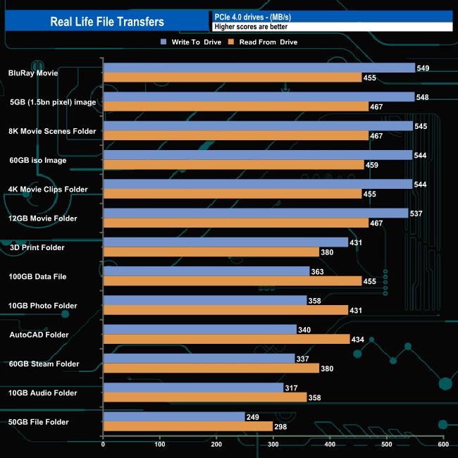 The MP600 GS handled our real-life file transfers pretty well, particularly when dealing with the larger file size transfers, averaging 544MB/s for writes and 461MB/s for reads when dealing with these file types.