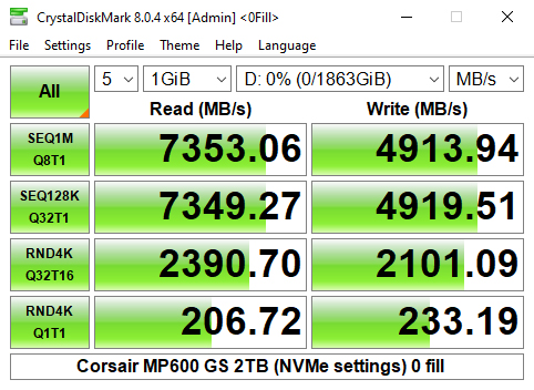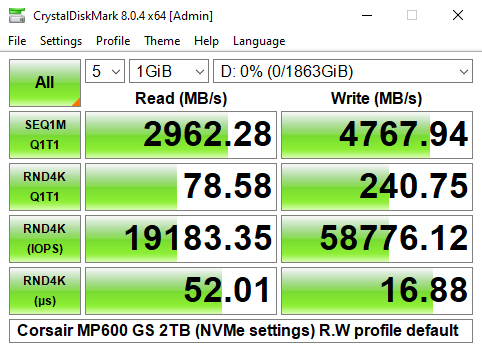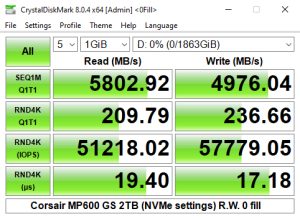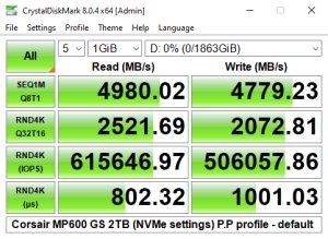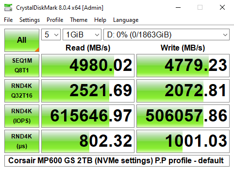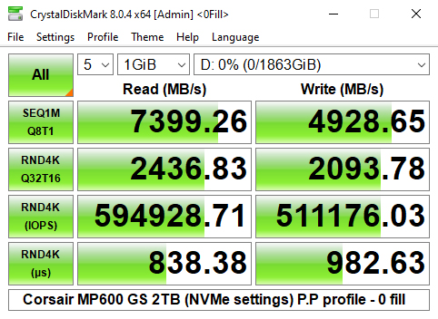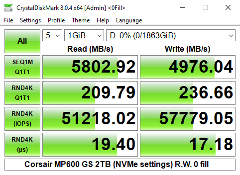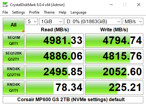 Corsair rate the Sequential performance of the 2TB MP600 GS as up to 4,800MB/s for reads and up to 4,500MB/s for writes. Using the default CrystalDiskMark 8 test we could not only confirm those figures but we coaxed a bit more out of the drive with test results of 4,981MB/s for reads and 4,794MB/s for writes.