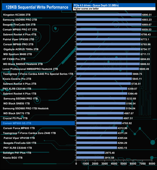 The MP600 GS performs best (at the tested queue depths) in relation to drives around it, at QD4 (3,327MB/s). At QDs 1, 2 and 32, it languishes near the bottom of our results chart.
