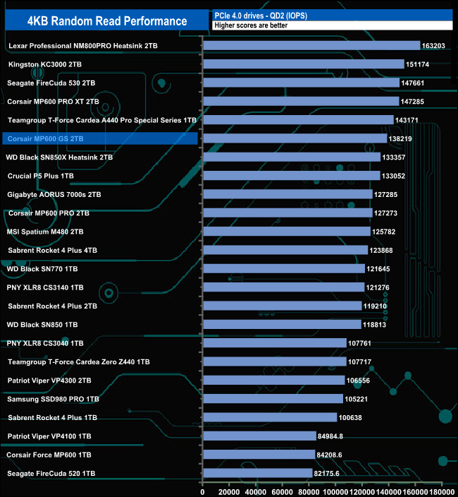 Corsair rate the 4K random read performance of the 2TB MP600 GS as up to 530K IOPS. With our 4-threaded testing, we couldn't get close to that figure, the best we saw was 360,398 IOPS (QD32). We ran a quick test of the drive using eight threads and got a result of 573,107 IOPS, confirming the official figure.