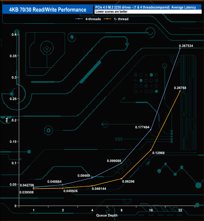We used CrystalDiskMark 8’s custom settings to test the 4K 70/30 mixed read/write performance of the drive through a range of queue depths using a single thread and four threads.