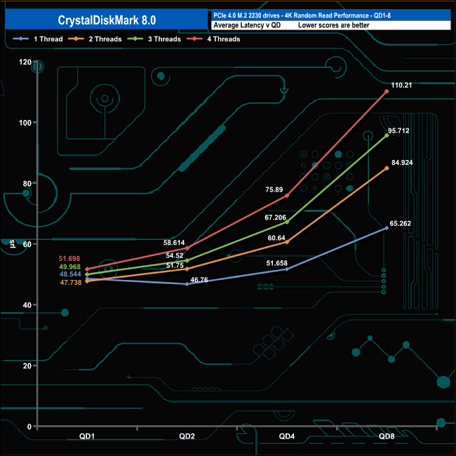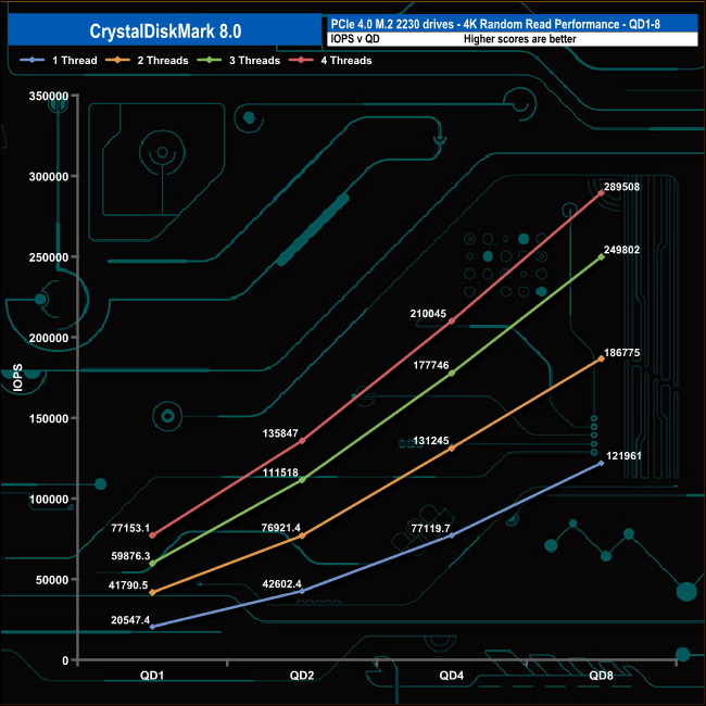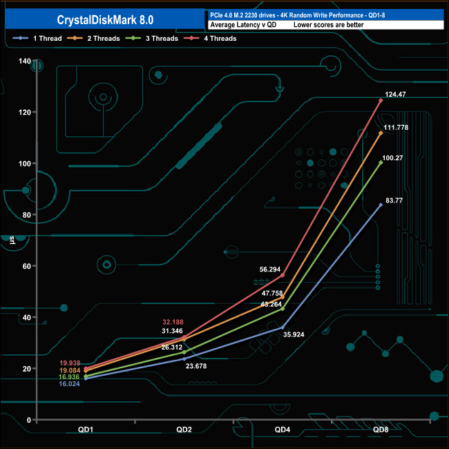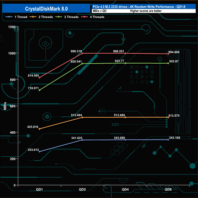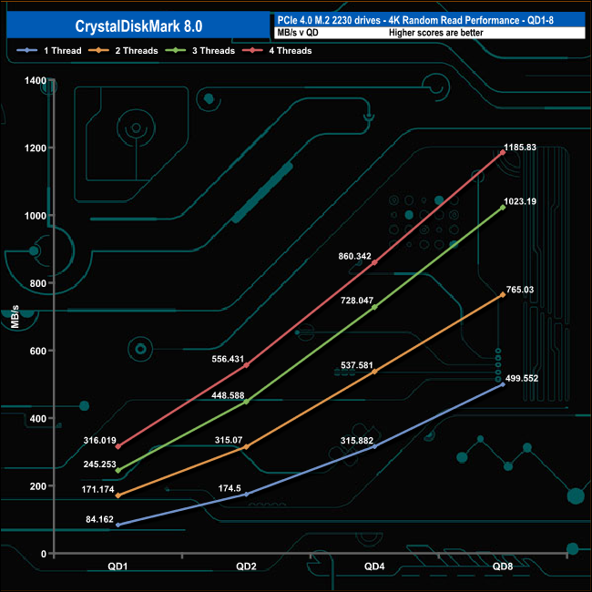 We used CrystalDiskMark 8 to test the random performance of the drive at lower queue depths (QD1 – QD8 where most of the everyday workloads occur) using 1 to 4 threads.