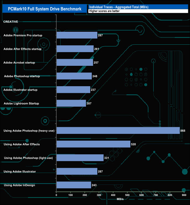 The PCMark 10 Full System Drive Benchmark uses a wide-ranging set of real-world traces from popular applications and common tasks to fully test the performance of the fastest modern drives. The benchmark is designed to measure performance of fast system drives using the SATA bus at the low end and devices connected via PCI Express at the high end.