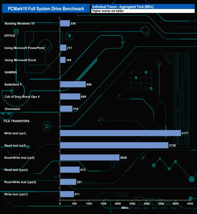 For the three gaming tests, the drive averaged just 667MB/s with the fastest being the Battlefield V trace at 886MB/s, next up the Call Of Duty Black Ops 4 trace at 698MB/s and finally Overwatch at 419MB/s. The file transfer tests also produced a good cp1 (write test) figure of 4,177MB/s backed up by 3,738MB/s for the cp3 (read test) and 2,048MB/s for the cp2 read/write test trace. For all six file transfer tests the drive averaged 1,943MB/s.