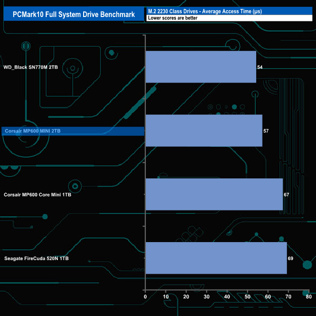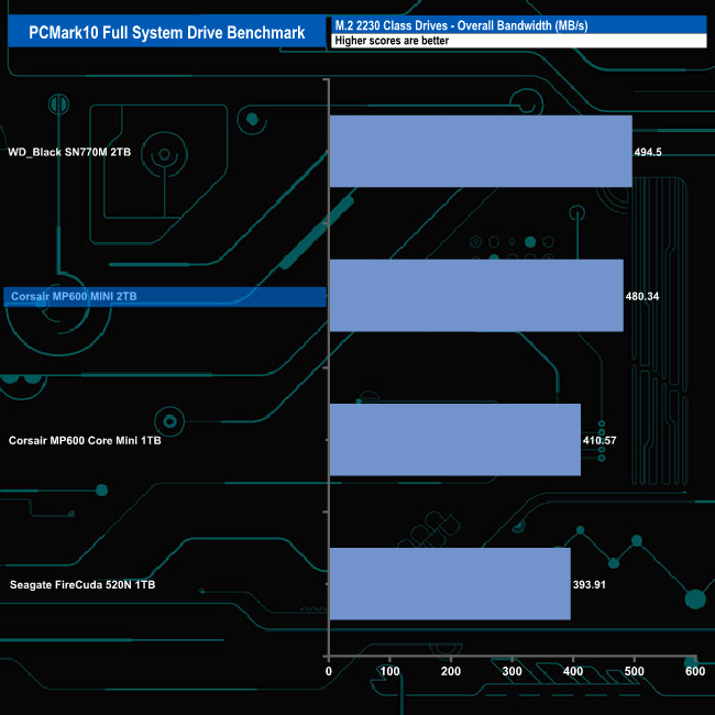 The overall bandwidth figure of 480.34MB/s sees the 2TB Corsair MP600 Mini sitting in second place behind WD's Black SN770M drive.