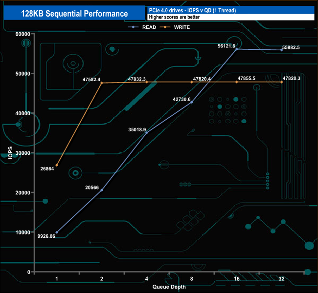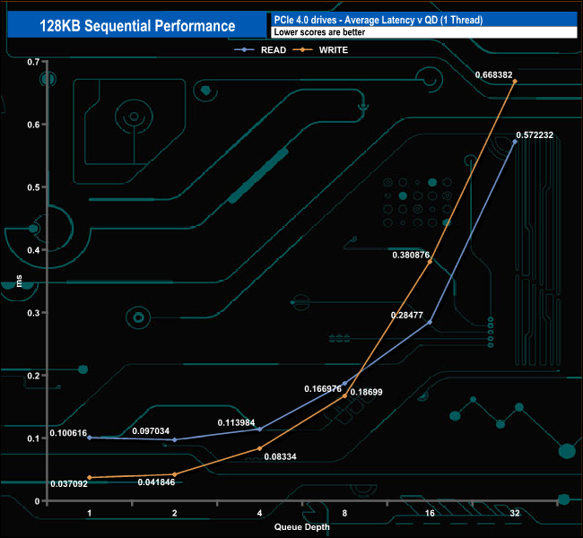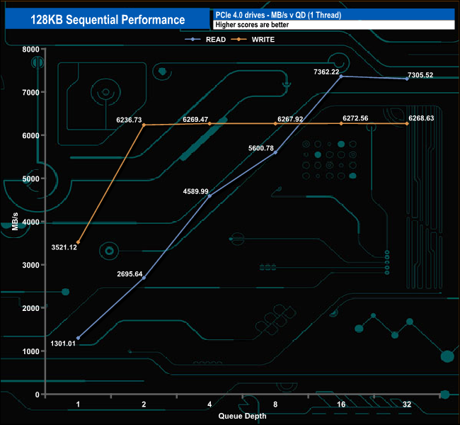 We used CrystalDiskMark 8‘s custom settings to test the Sequential read and write performance of the drive through a range of queue depths. The setup for the tests is listed below.