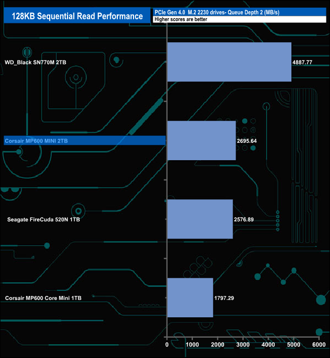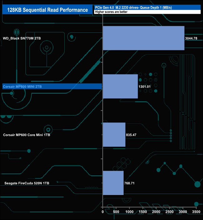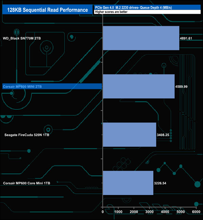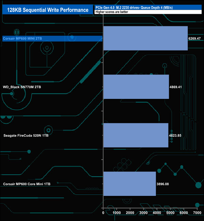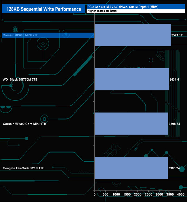 When it comes to the Sequential writes the drive outperforms all the other M.2 2230 drives at all the test queue depths by quite some distance apart from QD1 where the results are much closer.