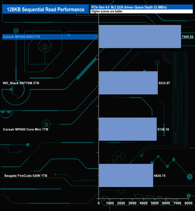 The drive sits in second place in our results chart at QD1,2 and 4 behind WD's Black SN770M (in the case of QD1 and 2, quite some way behind) but at QD32 the Corsair drive has the upper hand with a test result of 7,305MB/s, some 2,072MB/s faster than the WD drive.