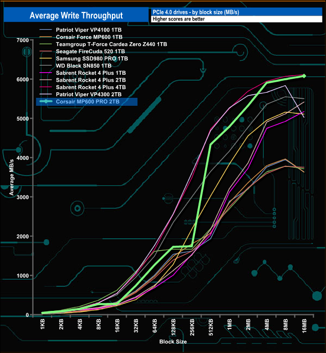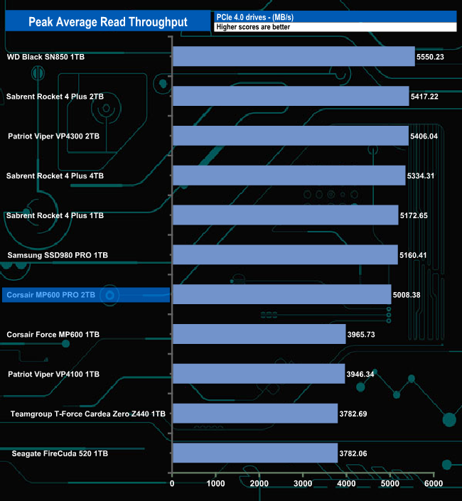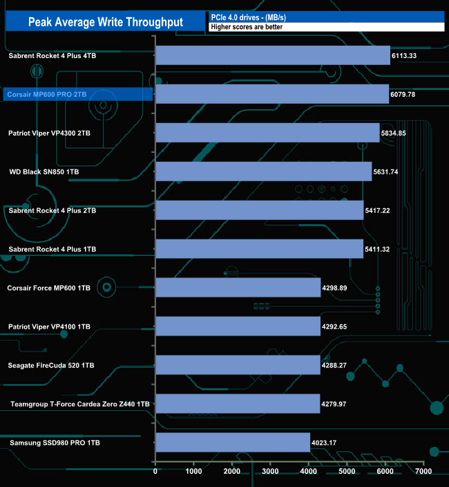 In the write throughout test, the drive peaked at the end of the test run at 6,079.78MB/s. That figure may be a little shy of the official maximum of 6,550MB/s but its good enough for 2nd place on our results table.