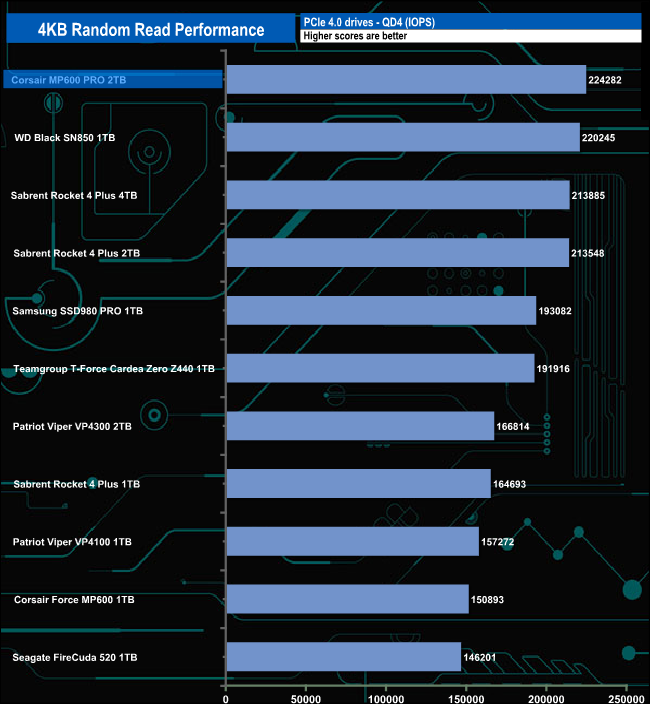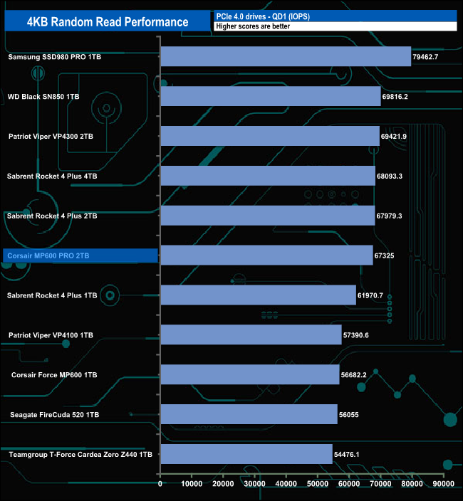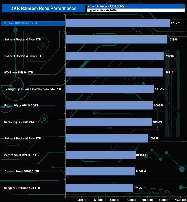 At QD1, the drive sits mid-table in our random read chart, but at QD's 2 and 4 the MP600 PRO sits on top of the lists. At QD32 the drive drops to third position in the chart.