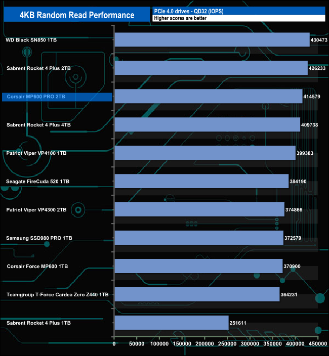 Corsair rate the 4K random read performance of the MP600 PRO at up to 660,000 IOPS. The best figure we saw from our custom CrystalDiskMark 8 settings was 414,579 IOPS at QD32.