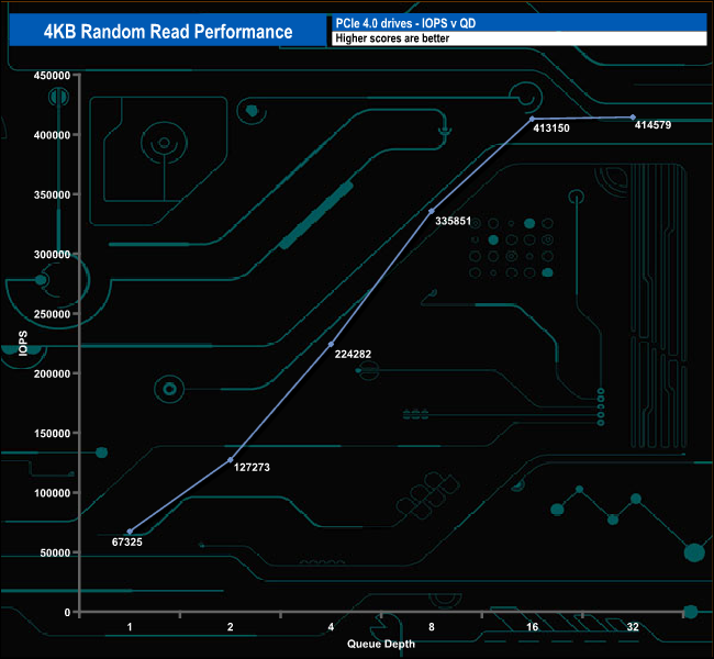 We used CrystalDiskMark 8‘s custom settings to test the 4K random read performance of the drive through a range of queue depths. The setup for the tests is listed below.