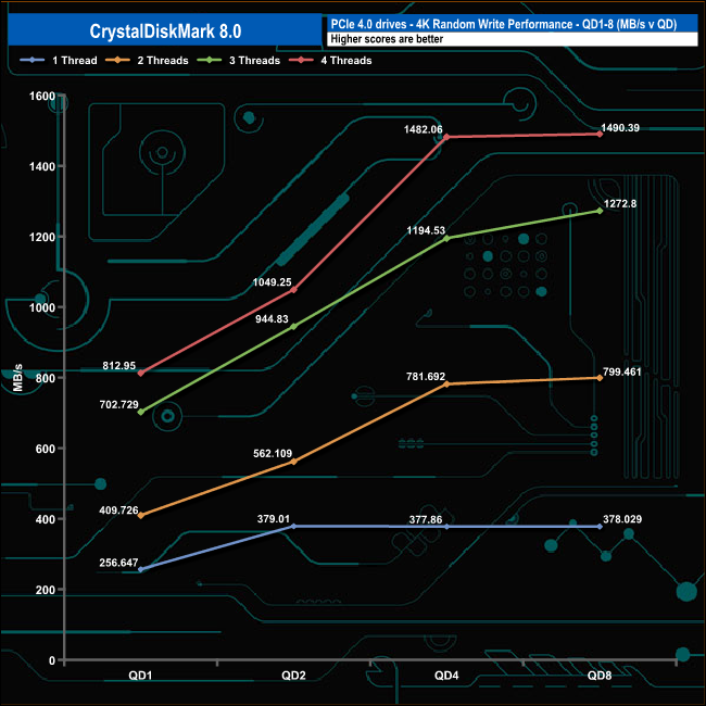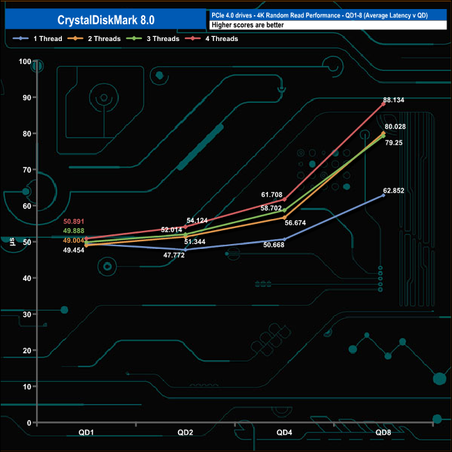 We used CrystalDiskMark 8 to test the random performance of the drive at lower queue depths (QD1 – QD8 where most of the everyday workloads occur) using 1 to 4 threads.