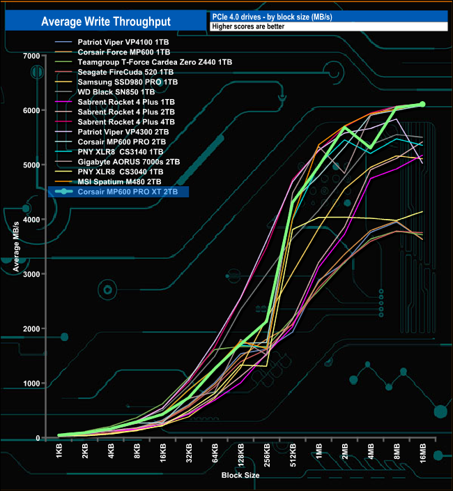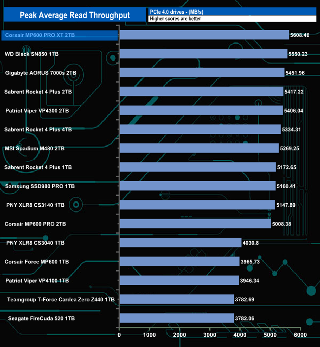 With a peak read throughput figure of 5,608.46MB/s, the Corsair MP600 Pro XT goes straight to the top of our results chart, topping WD's Black SN850 drive.