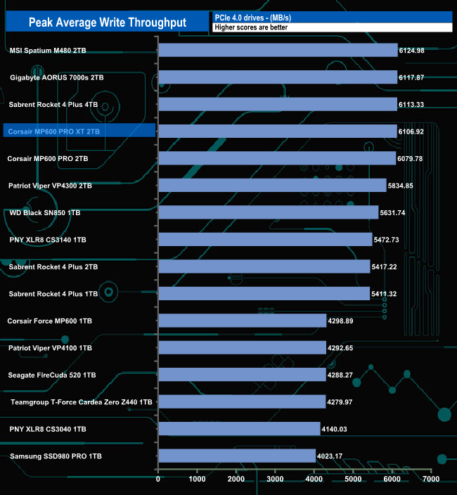 Unlike the read throughput result, the drives write score of 6,106.92MB/s sees it slip into the fourth spot on the results chart, above the previous MP600 Pro drive.