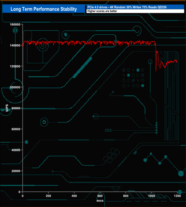 For the long term performance stability test, we set the drive up to run a 20-minute 4K random test with a 30% write, 70% read split, at a Queue Depth of 256 over the entire disk. The 2TB Corsair MP600 Pro XT averaged 140,008 IOPS for the test with an excellent performance stability of 97%, which is enterprise-grade stability.