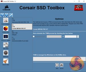 Corsair’s SSD management utility is called SSD Toolbox and although it might not have all the bells and whistles and funky GUIs that some of its competitors have, it has all the tools you will most likely ever need. It provides drive information and S.M.A.R.T details and also supports firmware updates, secure wiping of the drive, drive optimisation and incorporates a disk cloning utility.