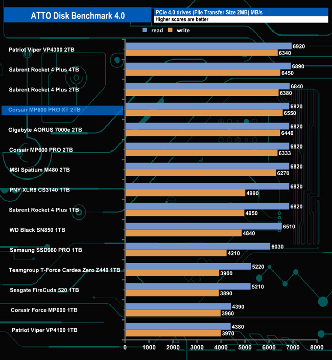 The official maximum Sequential read/write performance figures for the 2TB MP600 Pro XT are up to 7,100MB/s and 6,800MB/s respectively. Using the ATTO benchmark we couldn't quite hit either of these figures but the 6,820MB/s for reads and 6,550MB/s for writes are strong enough to place the drive in the top 5 of Gen 4 drive's we've tested to date.