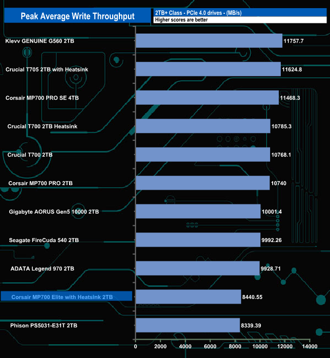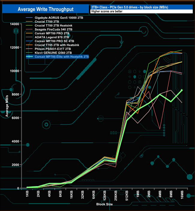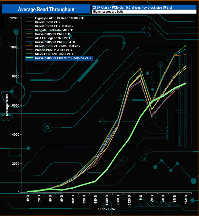 Although the Corsair drive throughput test result is nowhere near the official rating, it does keep it in touch, more or less, with the majority of the 10GB/s drives on this list.