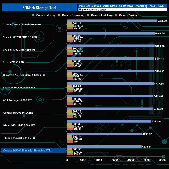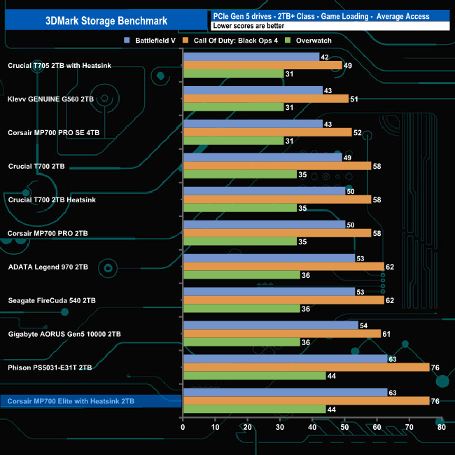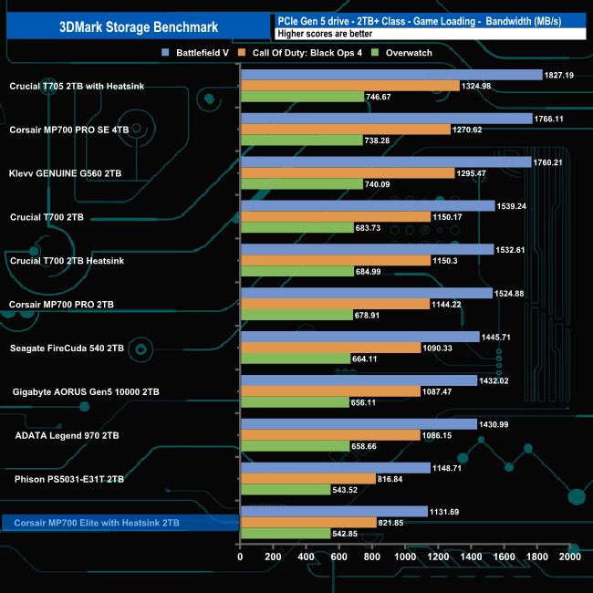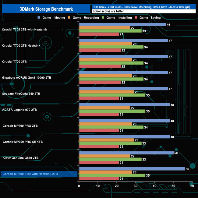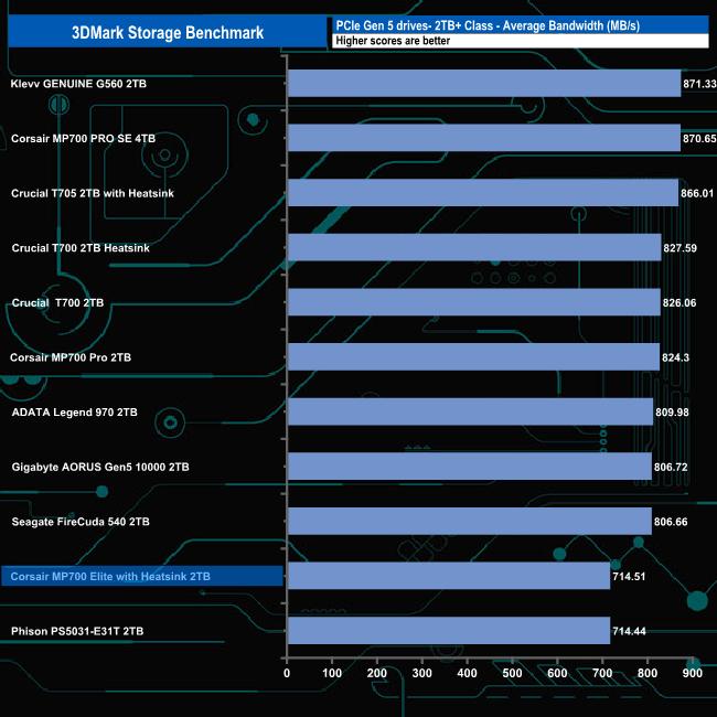 In 3DMark’s Storage Test, the MP700 Elite with Heatsink produced an average game loading bandwidth figure for the three games of 832.21MB/s with an average access time of 61µs, which is more or less the same performance as the Phison E31T reference design.