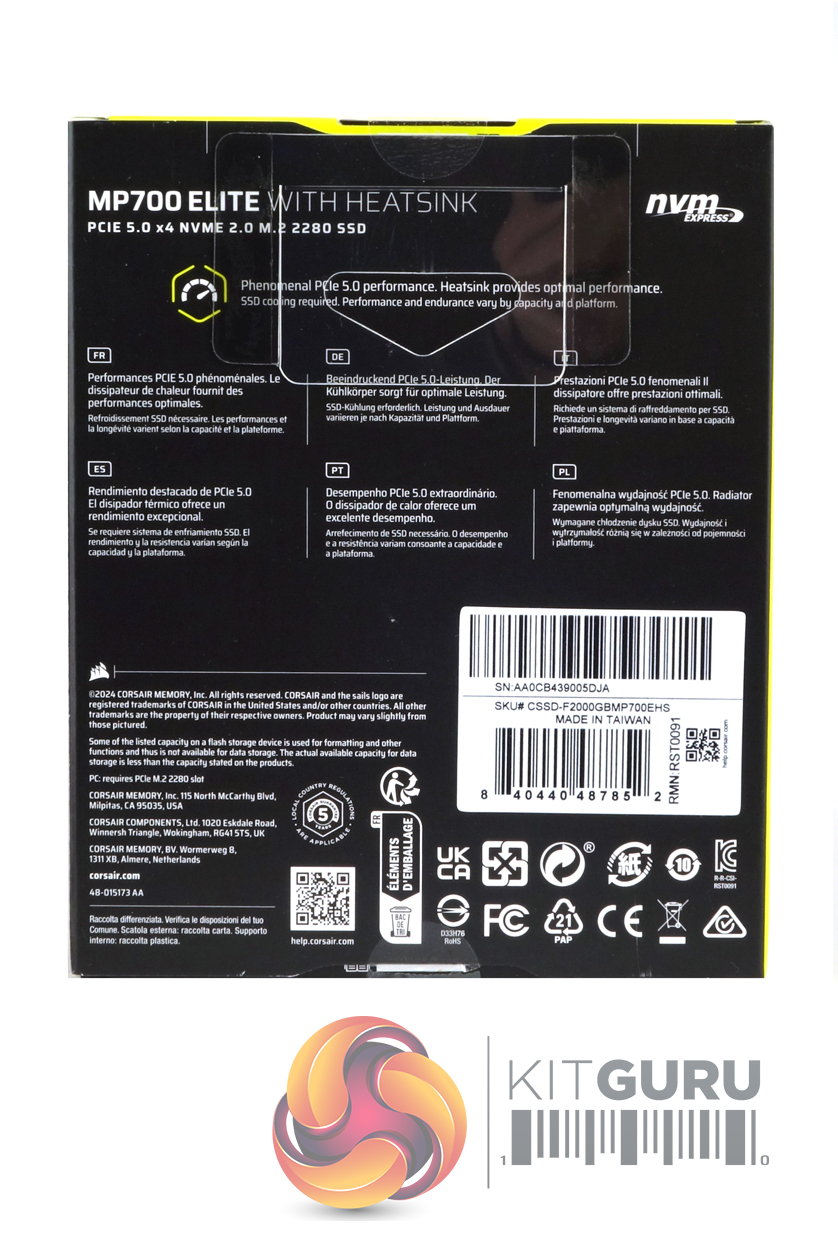 The drive comes in a compact box with a clear image of the drive on the front. Under the image is a strip label with performance figures for sequential reads and writes along with the drive’s capacity. The rear of the box has multilingual information about the drive's performance and there is a logo signifying the 5-year warranty Corsair backs the drive with.