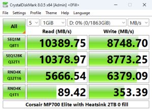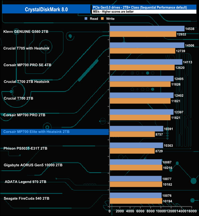 That 10,391.10MB/s read result sees the MP700 Elite with Heatsink leading a bunch of 10GB/s drives although its write performance is nowhere near as good.