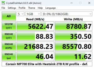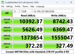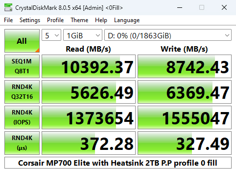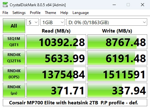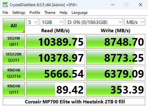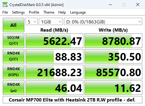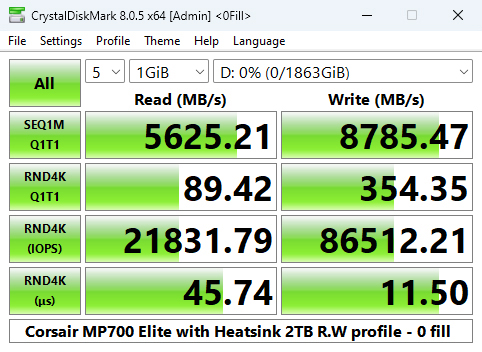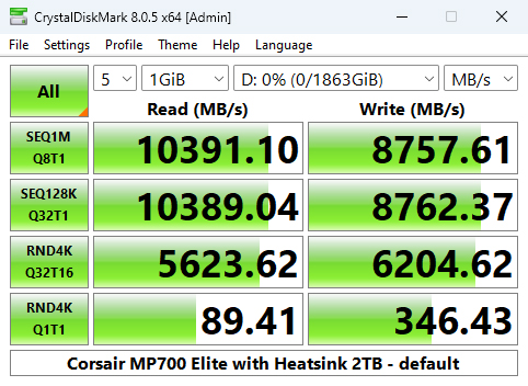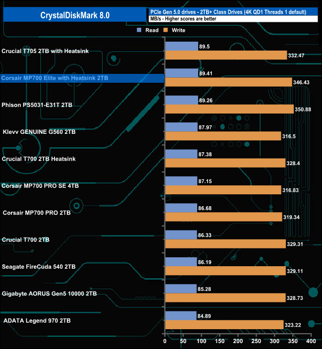 Corsair's MP700 Elite with Heatsink 2TB performs well in the CrystalDiskMark 8 4K QD1 T1 test, with a very good read score of 89.41MB/s but the thing that stands out is the write result of 346.43MB/s which is just shy of the fastest write performance we've seen in this test to date, which was from the reference Phison E31T drive.