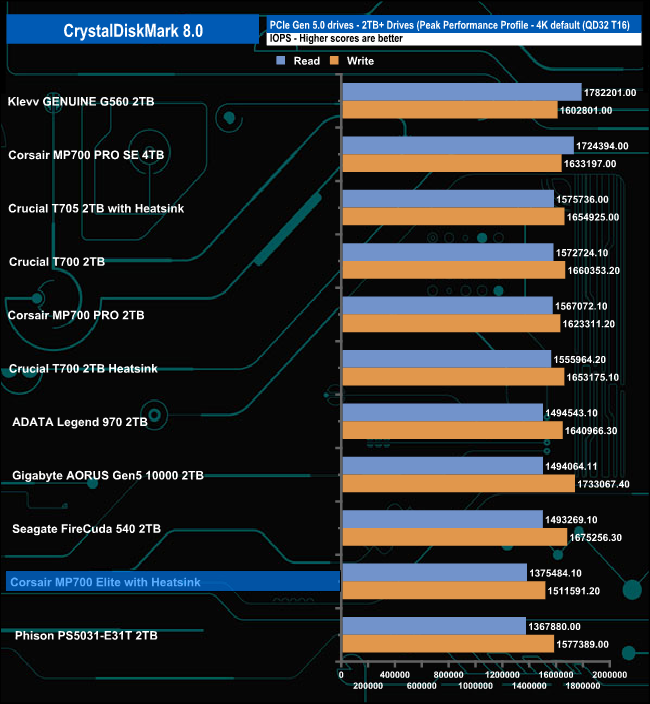 We can confirm the official random 4K figures for the drive of up to 1,300,000 IOPS for reads and up to 1,500,000 IOPS for writes using the Peak Performance profile of CrystalDiskMark 8 with default test results of 1,375,484 IOPS for reads and 1,511,591 IOPS for writes.