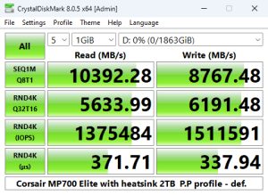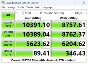 As you can see from the benchmarking screens we can confirm the official sequential ratings of the drive of up to 10,000MB/s for reads and up to 8,500MB/s for writes and better them a little with default test figures of 10,391.10MB/s for reads and 8,757.61MB/s for writes.