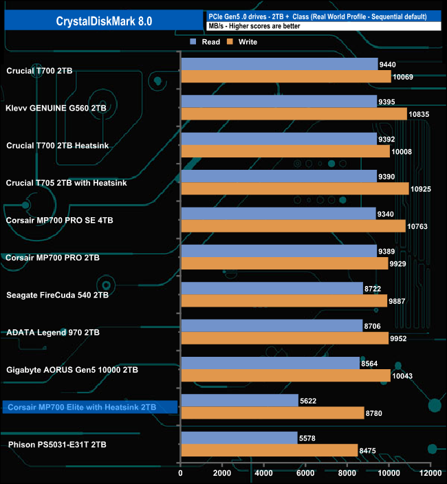 The Corsair MP700 Elite with Heatsink sits above the reference design E31T in the CrystalDiskMark 8 Real World result table with a read score of 5,622MB but its write performance at 8,780MB/s is better.