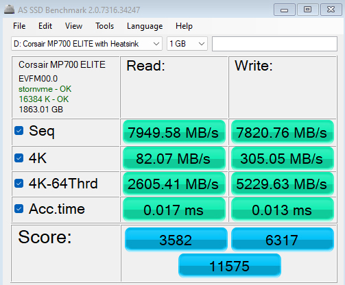 The Corsair MP700 Elite with Heatsink sits just above the reference Phison E31T with its read score of 3582 however, the reference design has a better write score.