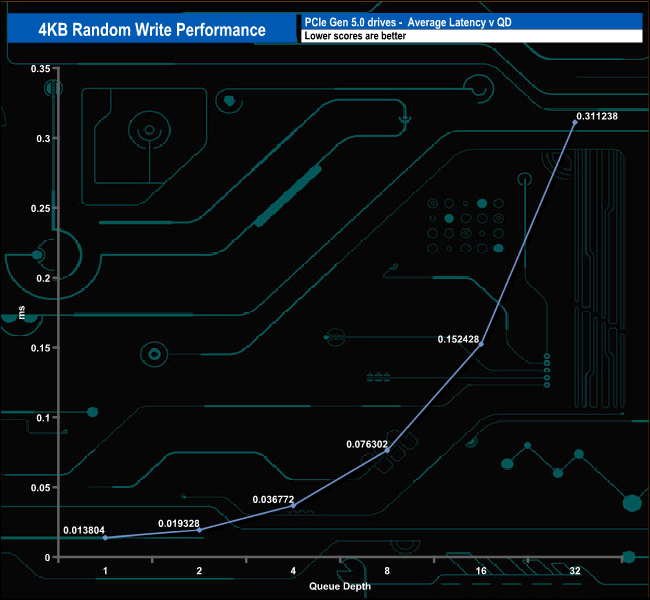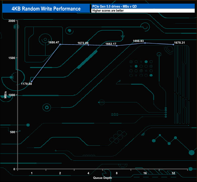 We used CrystalDiskMark 8‘s custom settings to test the 4K random write performance of the drive through a range of queue depths. The setup for the tests is listed below.