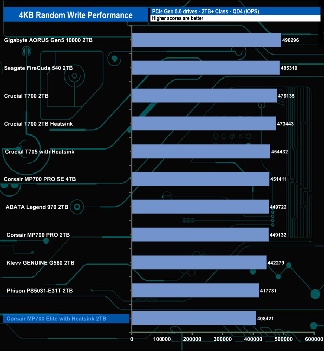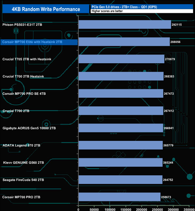 As with the random read result, the QD1 random write performance of the MP700 Elite with Heatsink is very impressive, outperforming all of the high-end drives in this list. Unfortunately, it doesn't maintain this position as once the queue depth deepens the performance of the drive compared to the rest of the Gen 5 drives here drops off and the drive drops to last place on the charts